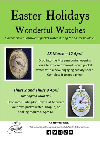 Visit the Cromwell Museum during opening hours throughout the Easter holidays to explore Cromwell’s own pocket watch with a new, engaging activity sheet. Complete it to get a prize!